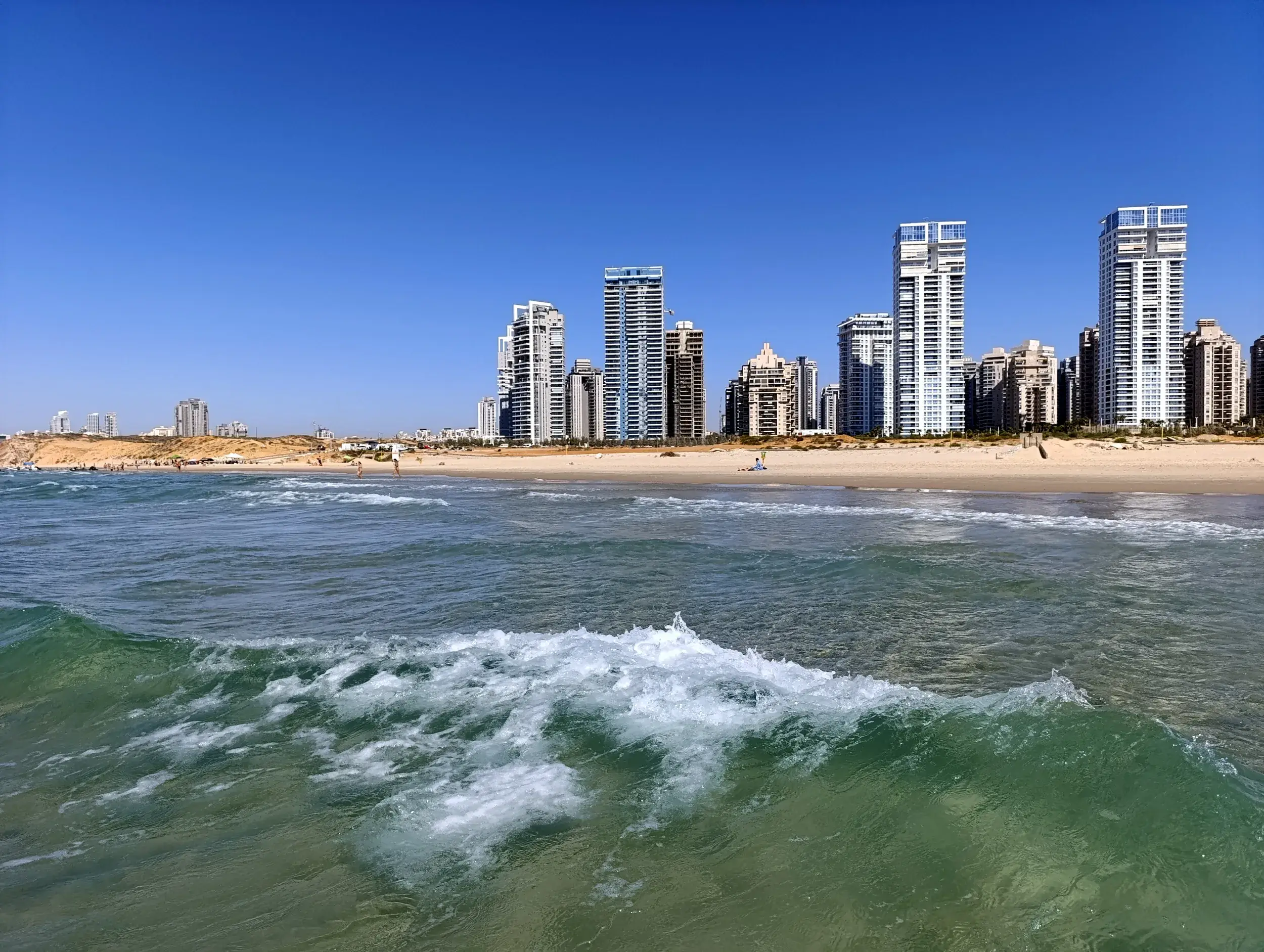 בקו האופק, המגדלים של עיר הימים מזדקרים בגאווה, תזכורת לעיר התוססת שקיימת ממש מעבר לחולות הזהובים. השמש הגבוהה שטפה את הכל באור חזק, ושלחה קרן אחת מדויקת שהטילה את הצל שלי – הצלם – ישירות אל תוך המים השקופים. הנוכחות שלי שם, בתוך התמונה, הפכה אותי לחלק מהרגע ולא רק לצופה מהצד.